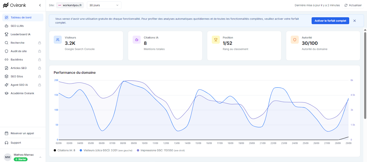 Ovirank intègre une veille IA : vous verrez si votre site est cité dans les réponses, sur quels mots-clés, et par quel modèle (ChatGPT, Perplexity, Claude...). Cela permet d’ajuster votre stratégie éditoriale en continu.